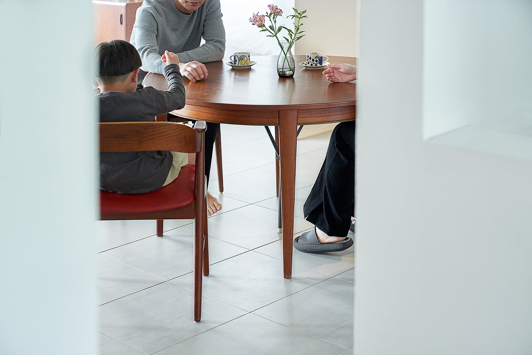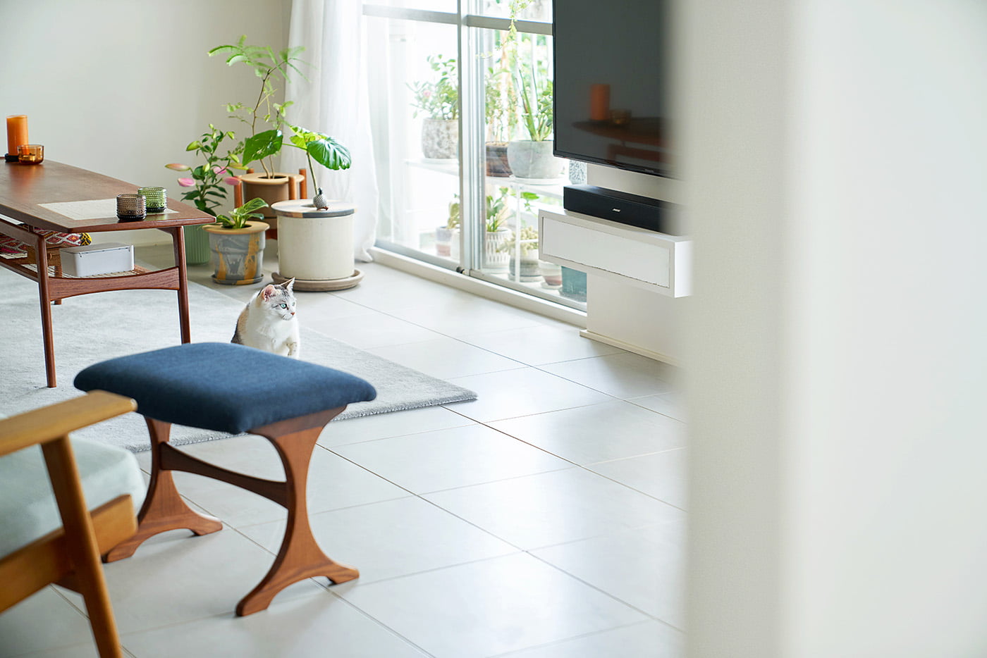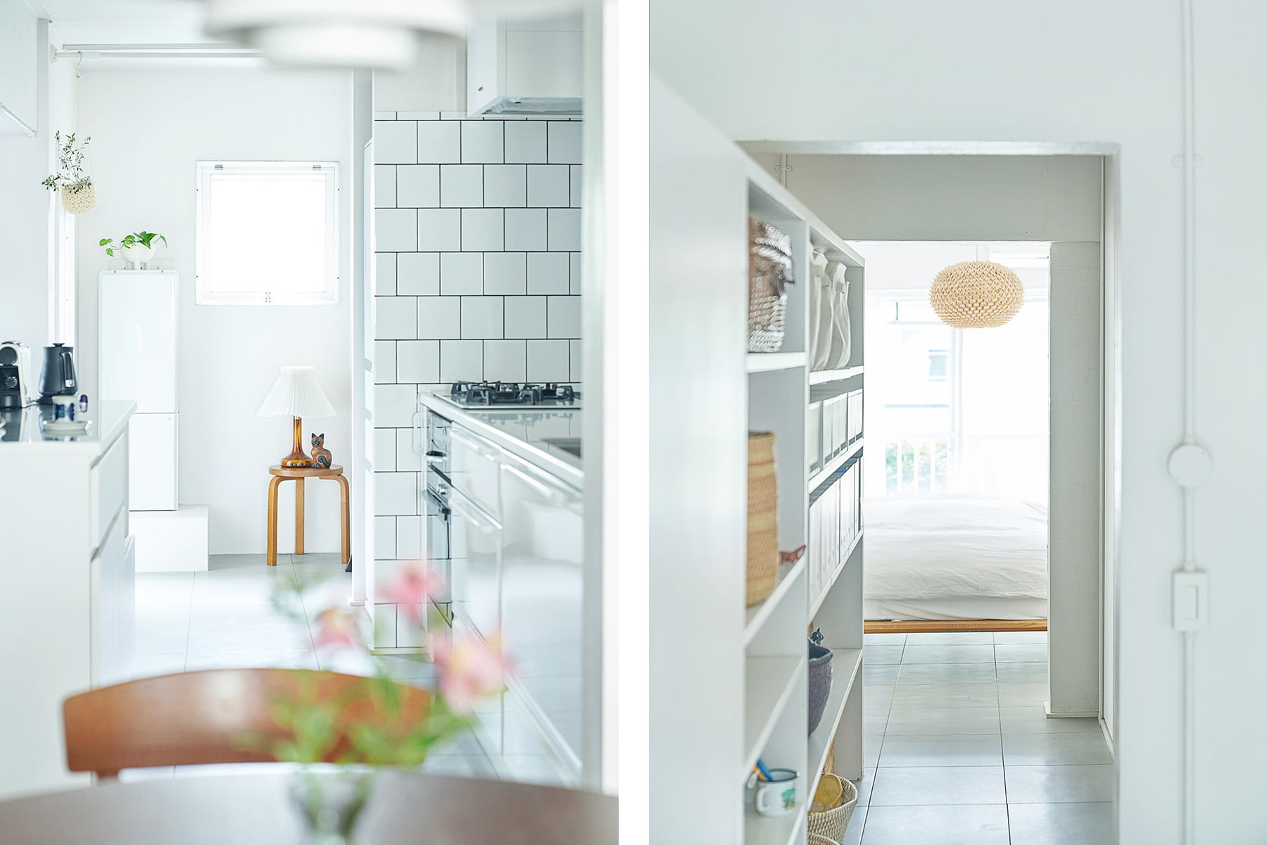 ノイズを吸い込むかのような、白塗装の壁と白タイルの床。しかしそれだけでこうした雰囲気にはならない。もとは壁式構造の3LDKだった間取りを、外せる壁は外して空間を広げ、外せない壁はさりげない仕切りとして利用。抜け感ではなく連続感による開放感を創出した。玄関からダイニングやリビングなど奥へと入っていくと、家具が点在する白いギャラリーを進みゆくような感じなのだ。